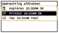 <OK> geeft aan dat een document zonder problemen is afgedrukt en <Fout> betekent dat een document niet is afgedrukt omdat de bewerking is geannuleerd of omdat er een fout is opgetreden.