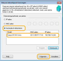 Selecteer [Automatische detecteren], selecteer het apparaat als dit is gevonden en klik op [Volgende].