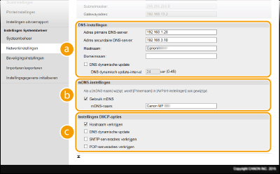 mDNS (multicast DNS) wordt ondersteund door Bonjour en is een protocol voor het koppelen van een hostnaam aan een IP-adres zonder DNS te gebruiken. Schakel dit selectievakje in om mDNS in te schakelen en voer de mDNS-naam in het vak [mDNS-naam] in. [Instellingen DHCP-opties][Hostnaam verkrijgen]