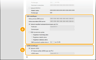 Schakel dit selectievakje in als u de DNS-records dynamisch wilt bijwerken wanneer het IP-adres van het apparaat verandert. Als u één of meer adrestypen wilt opgeven die u wilt registreren op de DNS-server, schakelt u het selectievakje [Registreer handmatig adres], [Registreer stateful adres] of [Registreer stateless adres] in. Als u een interval wilt instellen tussen updates, typt u het aantal uren in het tekstvak [DNS dynamisch update-interval]. [mDNS-instellingen][Gebruik mDNS]