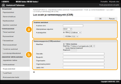 Koska laitteella luoduilla varmenteilla ei ole CA-allekirjoitusta, seurauksena voi olla tiedonsiirtovirhe laitteiden, joiden kanssa se siirtää tietoja, mukaan. Jotta varmenteen myöntäjä voisi myöntää CA-allekirjoituksen sisältävän varmenteen, sinun täytyy hankkia varmenteen allekirjoituspyynnön (CSR) tiedot, jotka pääkäyttäjä voi luoda Etäkäyttöliittymästä. Kun varmenne myönnetään, tallenna se avaimeen luodun CSR:n kanssa.