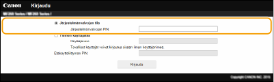 Kirjaudu sisään järjestelmänvalvojan tilassa syöttämällä PIN-koodi kohtaan [Järjestelmänvalvojan PIN].