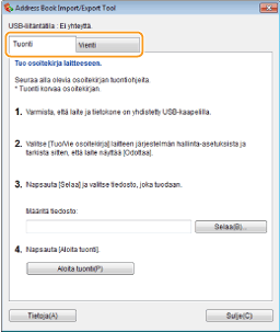 Käytä Address Book Import/Export Tool (Osoitekirjan tuonti-/vientityökalu -ohjelmaa) niin, että laite ja tietokone on yhdistetty USB-kaapelilla.