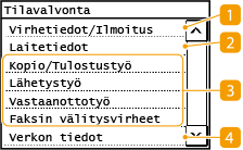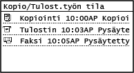 Näyttää valitun kohteen nykyisen tilan. Voit tarkistaa tilat <Lähetystyö>,<Vastaanottotyö> ja <Faksin välitysvirheet> vain kosketuspaneelimallissa. Alla näytetään esimerkkinä <Kopio/Tulostustyö> -näyttö.