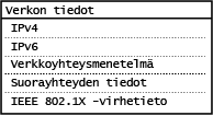 Näyttää verkkoasetukset, kuten laitteen IP-osoitteen, sekä tilan, kuten langattoman tiedonsiirron tilan.