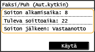 Voit asettaa laitteen vastaanottamaan fakseja automaattisesti, kun tuleva puhelu soi tiettynä aikana. <Kytke automaattiseen vastaanottoon>