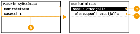 Käytettävissä oleva paperi), paperilähteelle käytetään asetusta <Nopeus etusijalla> sen sijasta. Tässä tapauksessa sinun on lisättävä paperit samalla tavalla kuin valittaessa <Nopeus etusijalla> (
