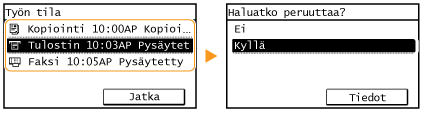Peruuttaminen etäkäyttöliittymästäVoit peruuttaa tulostuksen etäkäyttöliittymän [Työn tila] -sivulta: Tulostusasiakirjojen nykyisen tilan tarkistaminen