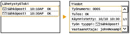 Kun <Näytä työloki> -asetukseksi on valittu <Ei>, et voi tarkistaa lähetettyjen asiakirjojen lokeja. <Näytä työloki>