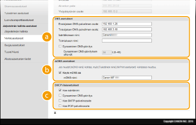 Valitse tämä valintaruutu, kun haluat, että DNS-tiedot päivitetään dynaamisesti aina, kun laitteen IP-osoite muuttuu. Määritä osoitetyyppi/-tyypit, jotka haluat tallentaa DNS-palvelimelle, valitsemalla valintaruutu [Tallenna manuaalinen osoite], [Tallenna tilallinen osoite], or [Tallenna tilaton osoite]. Määrittääksesi päivitysten välisen ajan, syötä aika tunteina [Dynaamisen DNS-päivityksen aikaväli] -tekstiruutuun. [mDNS-asetukset][Käytä mDNS:ää]