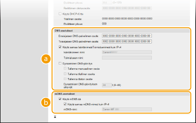 Valitse tämä valintaruutu, kun käytetään samaa mDNS-nimeä kuin IPv4:ssä. Jos haluat asettaa eri nimen, tyhjennä tämä valintaruutu ja syötä mDNS-nimi [mDNS-nimi]-kenttään. |