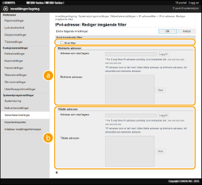 Hvis IP-adresser blir angitt feil, kan det hende at du ikke får tilgang til maskinen fra Fjernkontroll. I så fall må du angi <IPv4-adressefilter> eller <IPv6-adressefilter> til <Av>. <IPv4-adressefilter><IPv6-adressefilter>