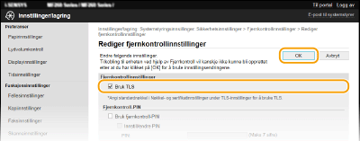 Bruke betjeningspaneletDu kan også aktivere eller deaktivere TLS-kryptert kommunikasjon fra <Meny>-skjermbildet. <Bruk TLS>