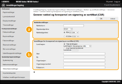 Ettersom sertifikater som genereres på maskinen ikke har en CA-signatur, kan en kommunikasjonsfeil oppstå avhengig av enhetene den kommuniserer med. For at sertifiseringsinstansen skal tildele sertifikatet med CA-signatur, må du innhente data for CSR (forespørsel om sertifikatsignering), som administratoren kan generere fra Fjernkontroll. Når sertifikatet er tildelt, registrerer du det i nøkkelen med det CSR-genererte sertifikatet.