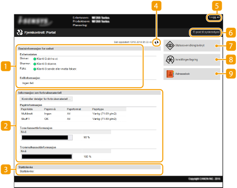 Når du logger inn på Fjernkontroll, vises følgende Portalside. Denne delen beskriver elementene som vises på Portalsiden og de grunnleggende handlingene.