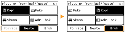 Et langt trykk på <Forrige> eller <Neste> flytter den valgte knappen uavbrutt.