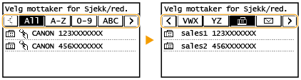 Du kan endre innstillinger, som å endre et registrert faksnummer eller navn, endre typen mottaker registrert som et faksnummer til en e-postmottaker, endre et kortnummer og legge til eller slette mottakergrupper. Du kan også slette mottakere eller grupper.