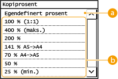 Du kan forstørre eller redusere kopier ved å bruke en forhåndsinnstilt kopiprosent som <141% A5->A4>, eller ved å stille inn en egendefinert kopiprosent i trinn på 1 %.