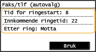 Du kan angi at maskinen skal motta fakser automatisk når et innkommende anrop ringer innen et angitt tidsrom. <Bytt til automottak>