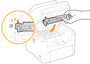 Du må ikke riste eller vippe tonerkassetten. Du må også unngå å utsette tonerkassetten for støt, for eksempel ved å slå den mot noe. Det kan føre til at toner som er igjen i tonerkassetten lekker. Ta tonerkassetten forsiktig ut i samme vinkel som sporet.