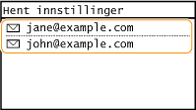Du kan velge en mottaker fra blant de siste mottakerne. Når du angir en tidligere brukt mottaker, bruker maskinen også de samme skanneinnstillingene, for eksempel tetthet, som du brukte forrige gang du sendte dokumenter til den mottakeren.
