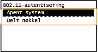 Når du kobler til et trådløst LAN, oppstår det en godkjenningsfeil på maskinen hvis godkjenningen av den delte nøkkelen er angitt på den trådløse ruteren. Hvis dette skjer, endrer maskinen automatisk innstillingen til <Delt nøkkel> og prøver tilkoblingen på nytt.