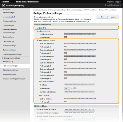 IPv6-adressene for maskinen kan konfigureres via Fjernkontroll. Før du angir IPv6-adresser, må du kontrollere IPv4-adresseinnstillingene (Vise IPv4-innstillinger). Du må angi riktige IPv4-innstillinger for å kunne bruke IPv6-adresser. Legg merke til at skannefunksjonen som bruker skannerdriveren eller MF Scan Utility, ikke er tilgjengelig i et IPv6-miljø. Maskinen kan bruke følgende IPv6-adresser:
