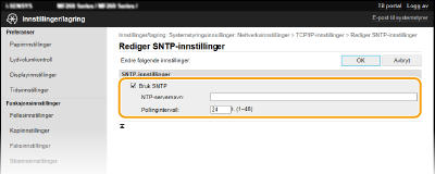 Merk av for [Bruk SNTP], og angi de nødvendige innstillingene.