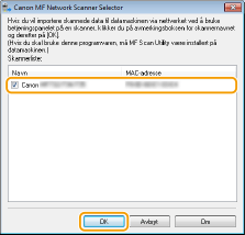 Hvis du vil bruke denne maskinen som en skanner, må du gjøre forberedelser på forhånd, inkludert installering av programvare på en datamaskin. Du finner mer informasjon i håndboken for de aktuelle driverne på nettstedet for netthåndbøkene. I Windows må du registrere denne maskinen i "MF Network Scanner Selector" med følgende prosedyre når du kobler denne maskinen til en datamaskin over trådløst eller kablet LAN. Denne prosedyren kreves ikke hvis maskinen og datamaskinen er koblet sammen over USB.