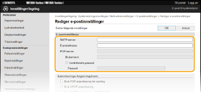 Bruk Fjernkontroll til å konfigurere innstillinger for sending, for eksempel innstillinger for POP-godkjenning og kryptering av kommunikasjon før du sender e-post. Kontakt nettleverandøren eller nettverksadministratoren for de nødvendige innstillingene.