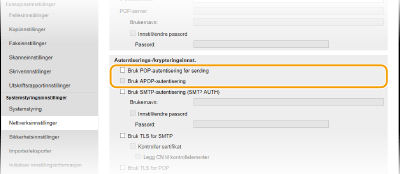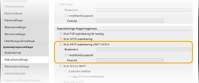 Hvis du konfigurerer SMTP-godkjenning (SMTP AUTH), utføres brukeridentifisering med brukernavn og passord på sendetidspunktet for e-posten.