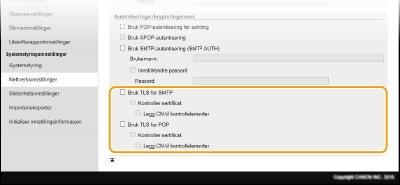 Merk av i boksen hvis du vil bruke TLS til å kryptere kommunikasjon med SMTP-serveren. Merk av for [Kontroller sertifikat] eller [Legg CN til kontrollelementer], alt etter hva du har behov for.