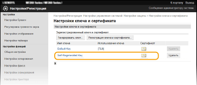 Ключ и сертификат невозможно удалить, если они в данный момент используются в каких-либо целях, например, если «[TLS]» отображается в разделе [Использование ключа]. В этом случае отключите функцию или замените ключ и сертификат перед их удалением.