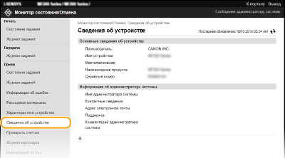 Отображение сведений об аппарате и администраторе системы. Эти сведения можно найти в [Управление системой] на странице [Настройки/Регистрация].