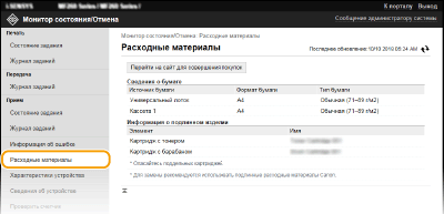 Отображение формата и типа бумаги для источника бумаги, номера модели картриджа с тонером и других сведений. Для отображения этой страницы можно также нажать кнопку [Проверить сведения о расходных материалах] на странице портала (главной странице) (