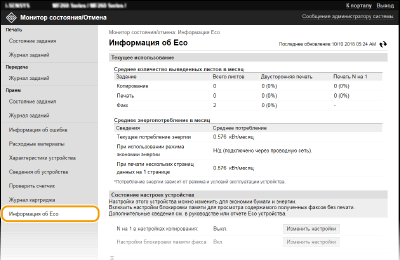 Можно проверить такую информацию, как количество отпечатков в месяц и количество потребленной электроэнергии.