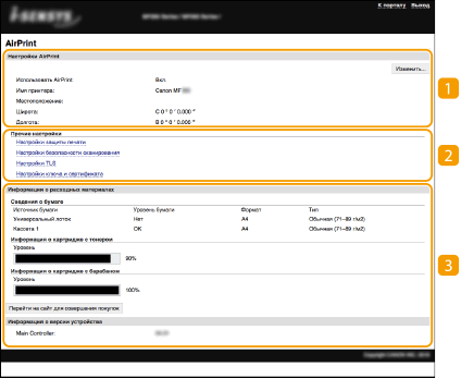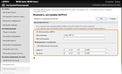 Если выбрано значение [Использовать AirPrint], для следующих параметров устанавливается значение «Вкл.».<Использовать HTTP>