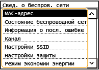 Параметры <Состояние беспроводной сети> и <Информация о посл. ошибке> можно просматривать из