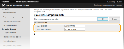 SMB (блок сообщений сервера) представляет собой протокол для общего доступа к ресурсам (например, файлам и принтерам) для нескольких устройств в сети. Аппарат использует SMB для сохранения сканированных документов в общую папку. В зависимости от особенностей сети, возможно, потребуется настроить имя NetBIOS и имя рабочей группы.
