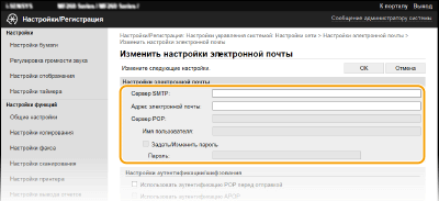 Используйте Удаленный ИП для настройки детальных параметров отправки (например, настроек проверки подлинности POP и шифрования связи перед отправкой электронной почты). Для получения необходимых настроек обратитесь к провайдеру или сетевому администратору.