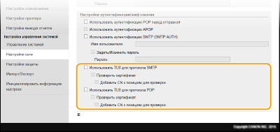 Установите этот флажок, чтобы использовать TLS для шифрования обмена данными с SMTP-сервером. Установите этот флажок в пункте [Проверить сертификат] или [Добавить CN к позициям для проверки] в зависимости от конкретной задачи.