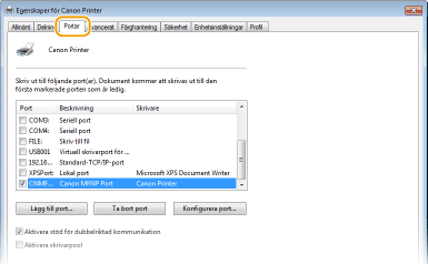 Om [Beskrivning] för den valda porten är [Canon MFNP Port], och datorn och enheten tillhör samma delnät kvarstår anslutningen. Du behöver inte lägga till en ny port. Om [Standard TCP/IP Port] visas måste du lägga till en ny port. Konfigurera skrivarportar