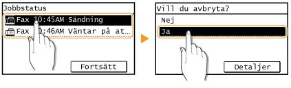Originalen har skannats och väntar på att behandlas. Välj dokumentet som ska avbrytas och välj <Ja>.
