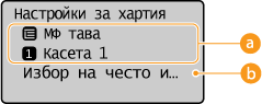 (Настройка за хартия) за избиране на хартията за копиране или печатане, се показва екранът <Настройки за хартия>. Изберете хартията върху екрана. Също така например можете да натиснете този бутон за промяна на настройките за хартия при зареждане на формат на хартия, различен от заредения по-рано. Имайте предвид, че настройката за хартия трябва да е правилно посочена, така че хартията да се подава правилно.
