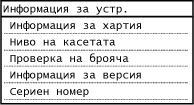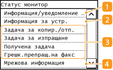 Показва състоянието на устройството, като например формата на хартията или количеството тонер, оставащо в тонер касетите.