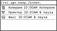 Показва текущото състояние на избрания елемент. Можете да проверите състоянията на <Задача за изпращане>,<Получена задача> и <Грешки при препращане на факс> само на модел със сензорен панел. Екранът <Задача за копиране/отпечатване> е показан по-долу като пример.