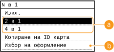 ), <Копир.ID к.>/<Копиране на ID карта> или <Коп. пасп.>/<Копиране на паспорт>.Когато копирате множество оригинали върху една страница, в копираното изображение може да бъдат създадени бели полета.
