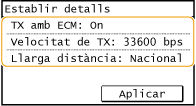 A <Menú>  <Opcions de fax>, podeu definir opcions detallades per a destinacions. No obstant això, les opcions definides des de <Llib d'adr.> estan habilitades per a les opcions detallades de destinacions desades a la llibreta d'adreces.