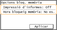Per imprimir els documents rebuts a la memòria, establiu <Opcions de bloqueig de memòria> en <Desactivat>. S'imprimeixen tots els documents de la memòria.