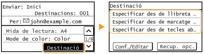 Si se selecciona una destinació de la <Llib d'adr.> a la pantalla Inici, es poden configurar les opcions per a l'enviament de correus electrònics o el desament de fitxers mentre la destinació seleccionada romangui especificada.